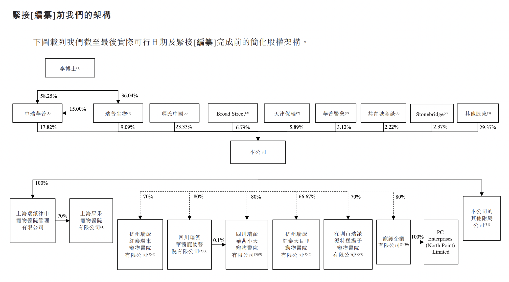 截至递表前,瑞派宠物由李守军通过中瑞华普间接持有约17.82%的股份,及通过瑞普生物间接持有约9.09%的股份。因此,李守军作为公司的单一最大股东,共控制公司约26.91%的已发行股本权益。